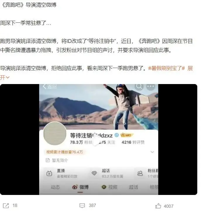 《驱驰吧》播出的期间,节目组开启蒙眼撕名牌的时事,其时周深被拖拽,这么的情况出现,周深的粉丝让节目组给说法,然后“跑男导演姚译添”话题登上热搜,大师发现他倏得清空我方的外交账号,并修改成“恭候刊出中”。