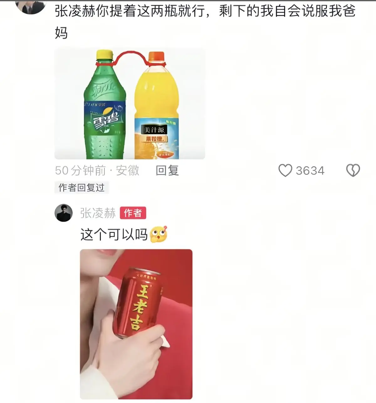 看到这么的音讯,好多网友都思到网友们的玩梗,其时有网友清楚:张凌赫,你就拎着这两瓶就行,剩下的我会劝服我爸妈,效用张凌赫简直评述了,竟带着王老吉来了。